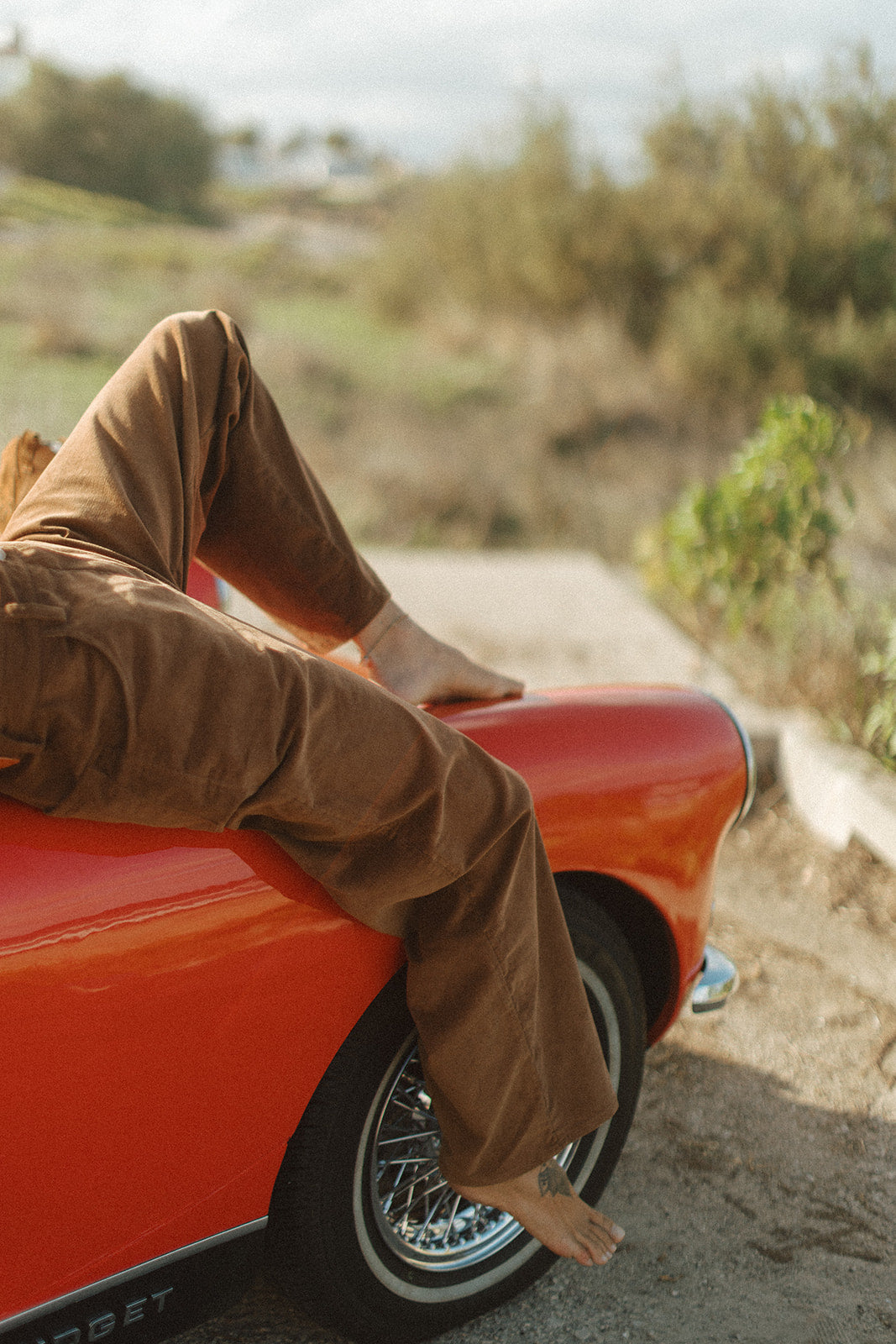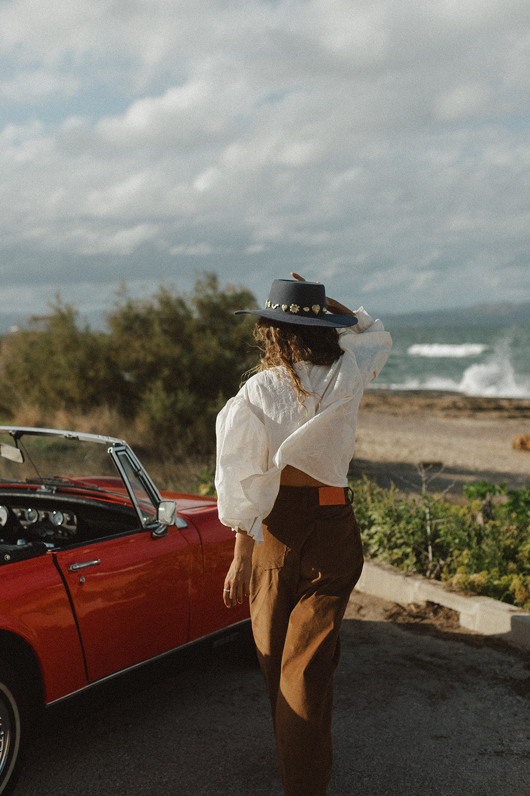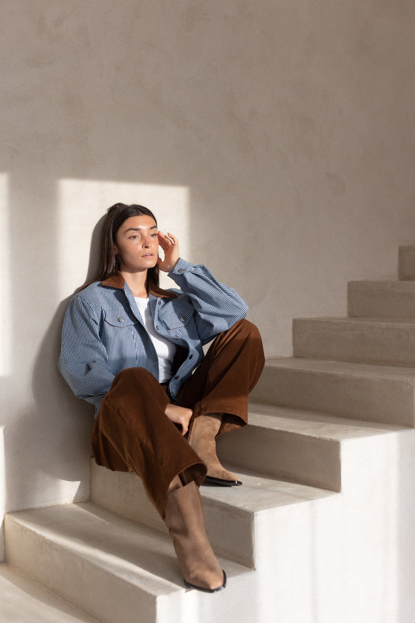 Druhým farebným prevedením nohavíc ALCUDIA je hnedý corduroy. Vznikli zo strihu, ktorý ja osobne milujem – a síce barrel. Majú klasické zadné vrecká, ako je na denim nohaviciach zvykom, a taktiež na nich nájdete koženú etiketu vyrobenú českou značkou EGGO. Je pre ne typický vysoký pás, ktorý je navrhnutý presne na dĺžku bundy ISOLA. Perfektne sa hodia k navy bunde LENA z kolekcie BERLIN POISE a viem si ich predstaviť oblečené k chunky svetrom v zemitých farbách, s ktorými vytvoria dokonalý jesenný outfit.