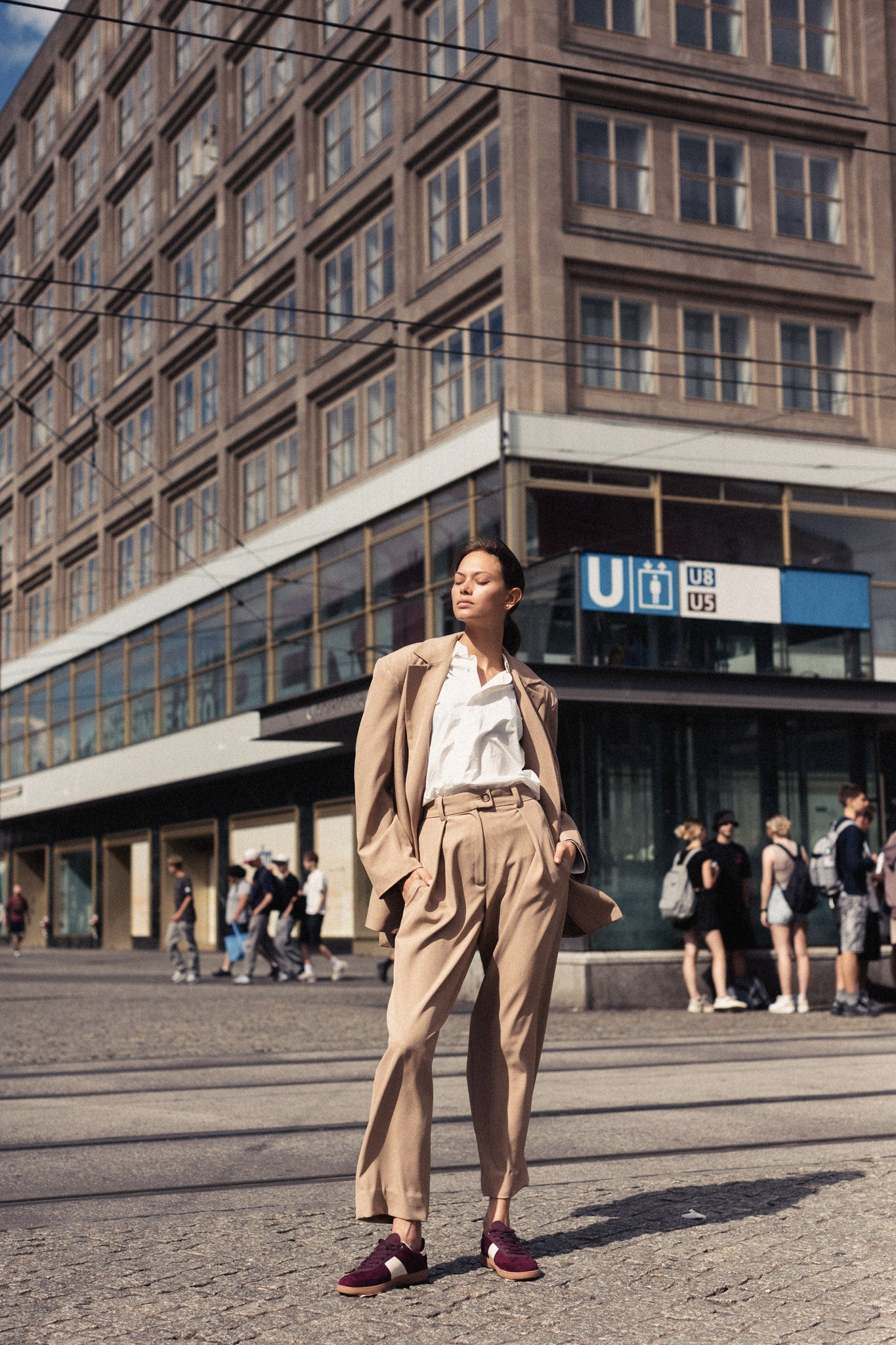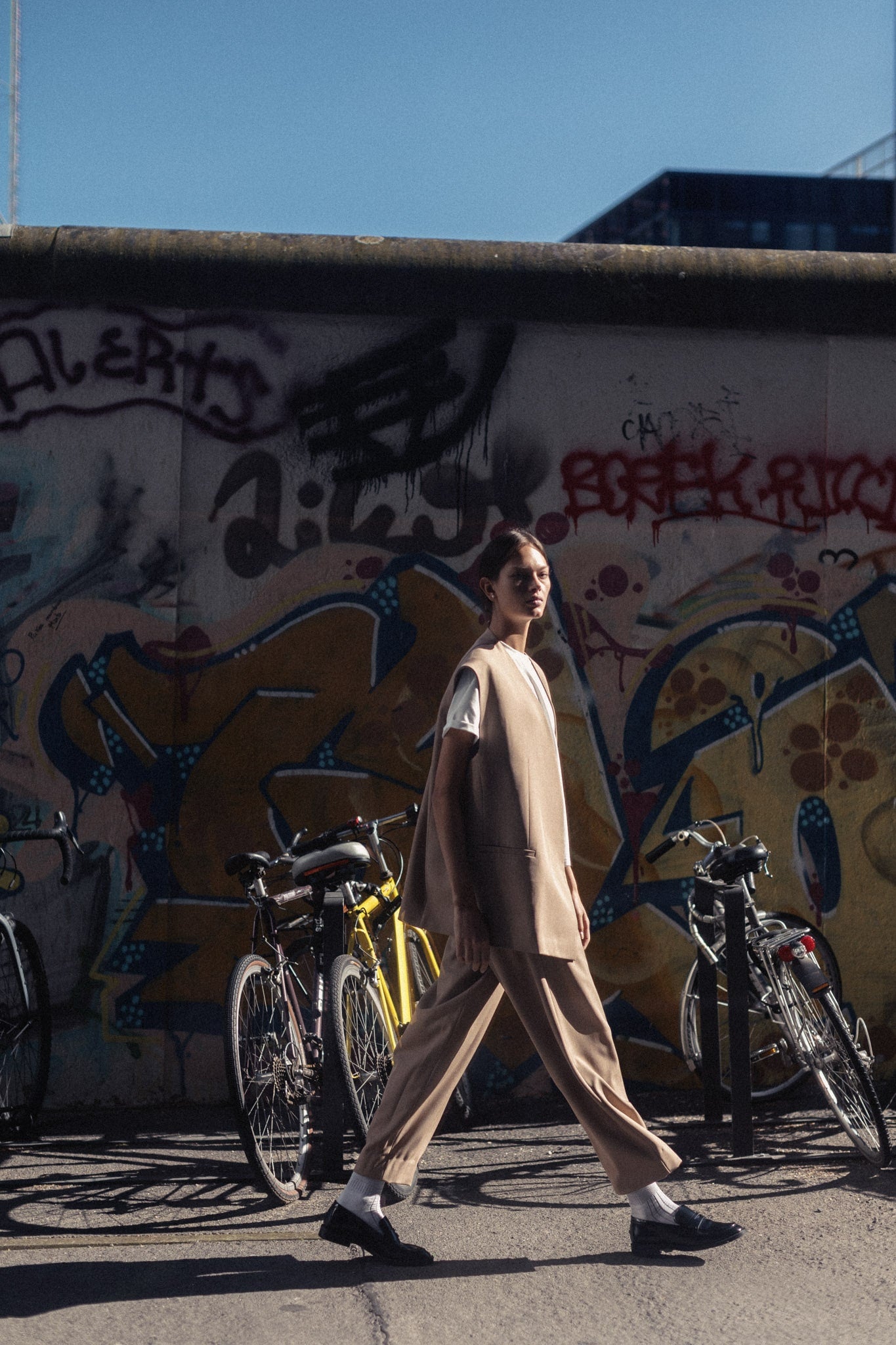 Vlajkovými modelmi tejto kolekcie je trio nohavicových kostýmov, ktoré sa od seba odlišujú strihom saka, ale aj nohavíc. Čo však majú spoločné? Tažko štýlový a nadčasový oversized ležérny strih. Použili sme tri základné farby, ktoré v šatníku každej ženy nesmú chýbať. Jednou z nich je farba camel. ARDEN nohavice majú kotníkovú dĺžku, na prednom diele majú dva veľké efektné puky, ktoré podčiarknu ich barrel strih. Mimo rovnomenného saka sa dokonale hodia k prešívanej bunde LENA resp. prečo ich nematchnúť so sakom NOX alebo SOREN?