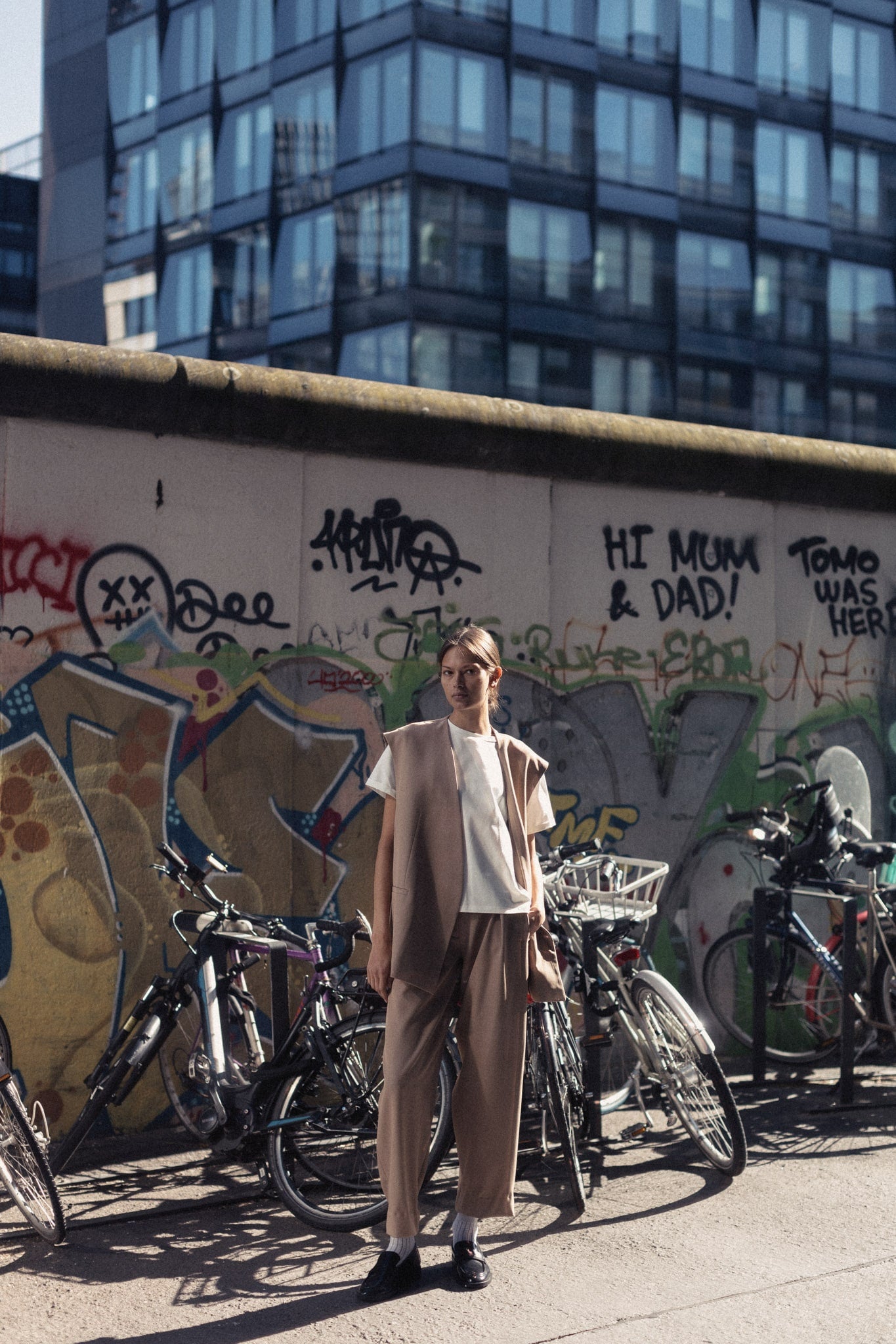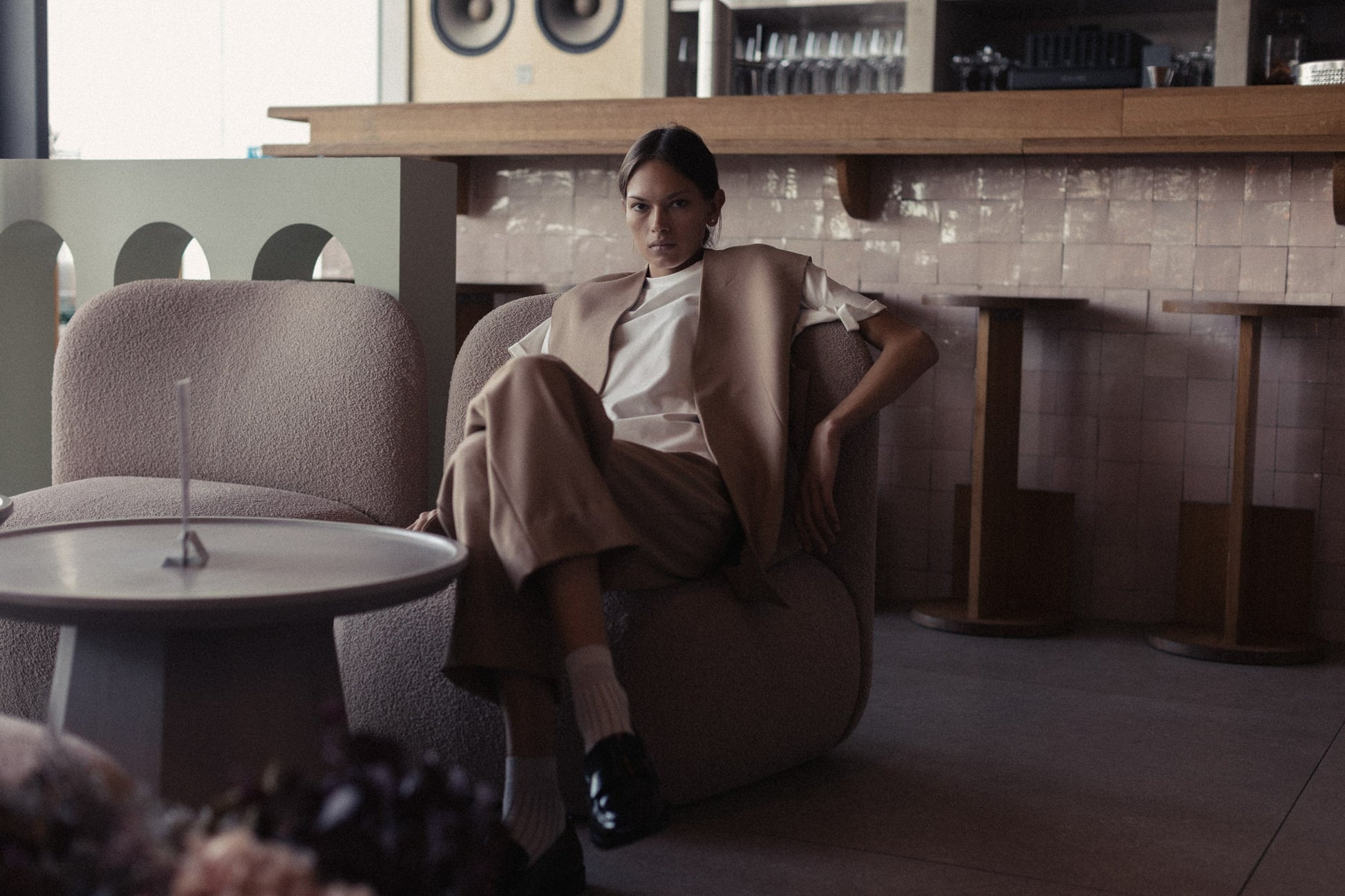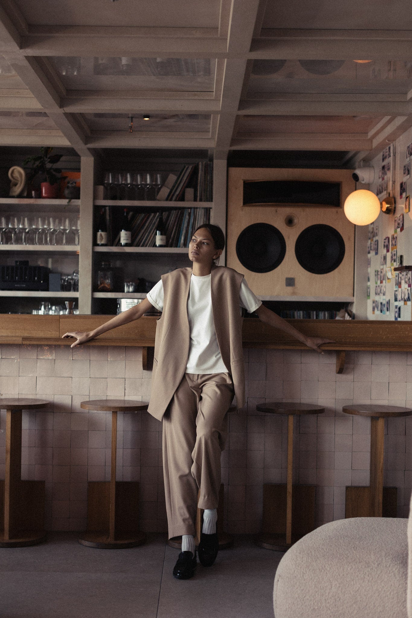 Vlajkovými modelmi tejto kolekcie je trio nohavicových kostýmov, ktoré sa od seba odlišujú strihom saka, ale aj nohavíc. Čo však majú spoločné? Tažko štýlový a nadčasový oversized ležérny strih. Použili sme tri základné farby, ktoré v šatníku každej ženy nesmú chýbať. Jednou z nich je farba camel. Model ARDEN má ako jediný to privilégium, že je k nemu ušitá aj oversized vesta. Brutálne efektný kúsok. Otestovala som ju spolu s jeansami, ktoré dali môjmu looku extrémne cool casual feeling. Na prednom diele má funkčné vrecká a je podšitá viskózovou podšívkou. Neviete čo pod ňu? Skúste sa porozhliadnuť po jednom z našich basicov.