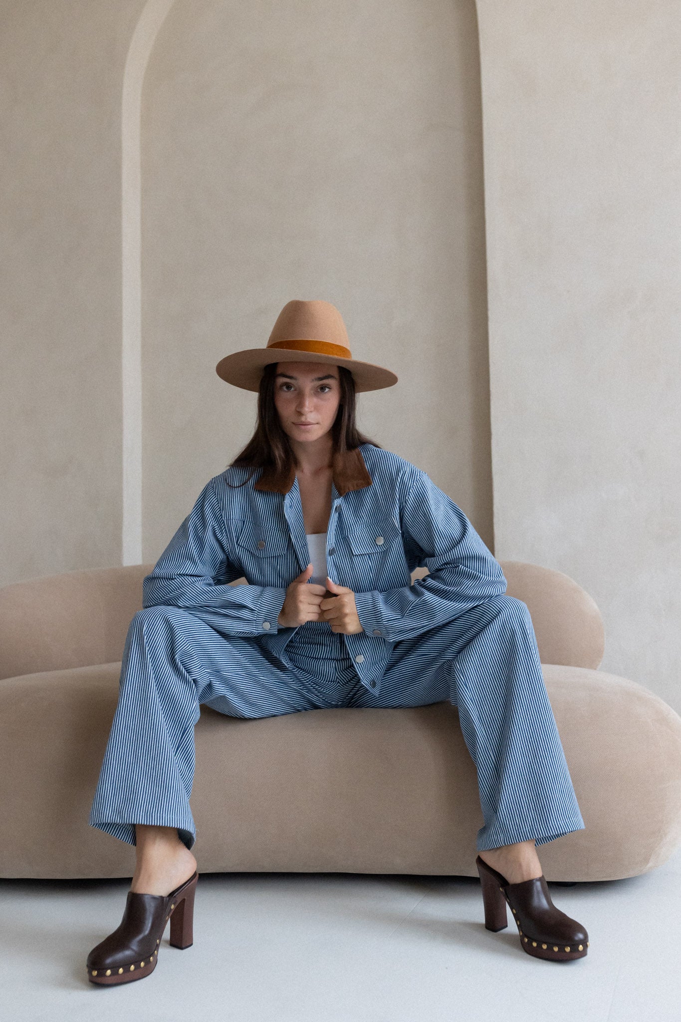S denimovými setmi ešte nekončíme. Tento prúžkovaný je módna pastva pre oči. Skladá sa z denim bundy ISOLA a nohavíc ALCUDIA. Poďme si teda predstaviť bundu ISOLA. Má typické kovové gombíky, aké by mala mať poriadna riflovka, a jej golier ozvláštňuje hnedý corduroy, ktorý v tejto kolekcii ešte dostane slovo. Na zadnom diele má koženú etiketu z dielne českej značky EGGO, s ktorou som tento rok nadviazala spoluprácu – a nemôžem byť z toho šťastnejšia. Má bomberkový strih a okrem svojej setovej košele ju viete skombinovať s corduroy nohavicami ALCUDIA. A pre dokonalý matchy look si na plece prehoďte corduroy tašku SERRA a pohľady okoloidúcich budú vaše!