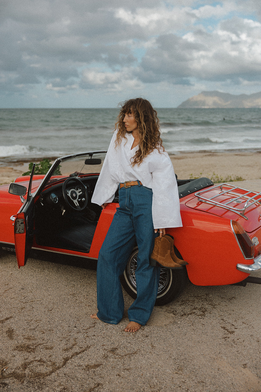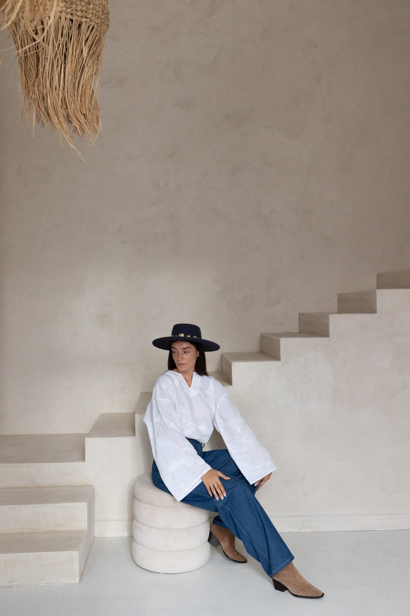 Ďalšou blúzkou v kolekcii FOUND IN LIGHT je biela kráska LAURA. Ušitá je zo 100 % bavlnenej vyšívanej látky a jej dominantou sú široké zvonové rukávy, ktoré pôsobia úžasne najmä keď si blúzku zastrčíte do nohavíc. Na prednej časti má malý véčkový výstrih, ktorý dodáva jemný, ženský nádych. Ľahko ju zladíte s jacquardovou bundou NAMASTE alebo pre elegantnejší efekt siahnite po nohaviciach NOX z kolekcie BERLIN POISE.