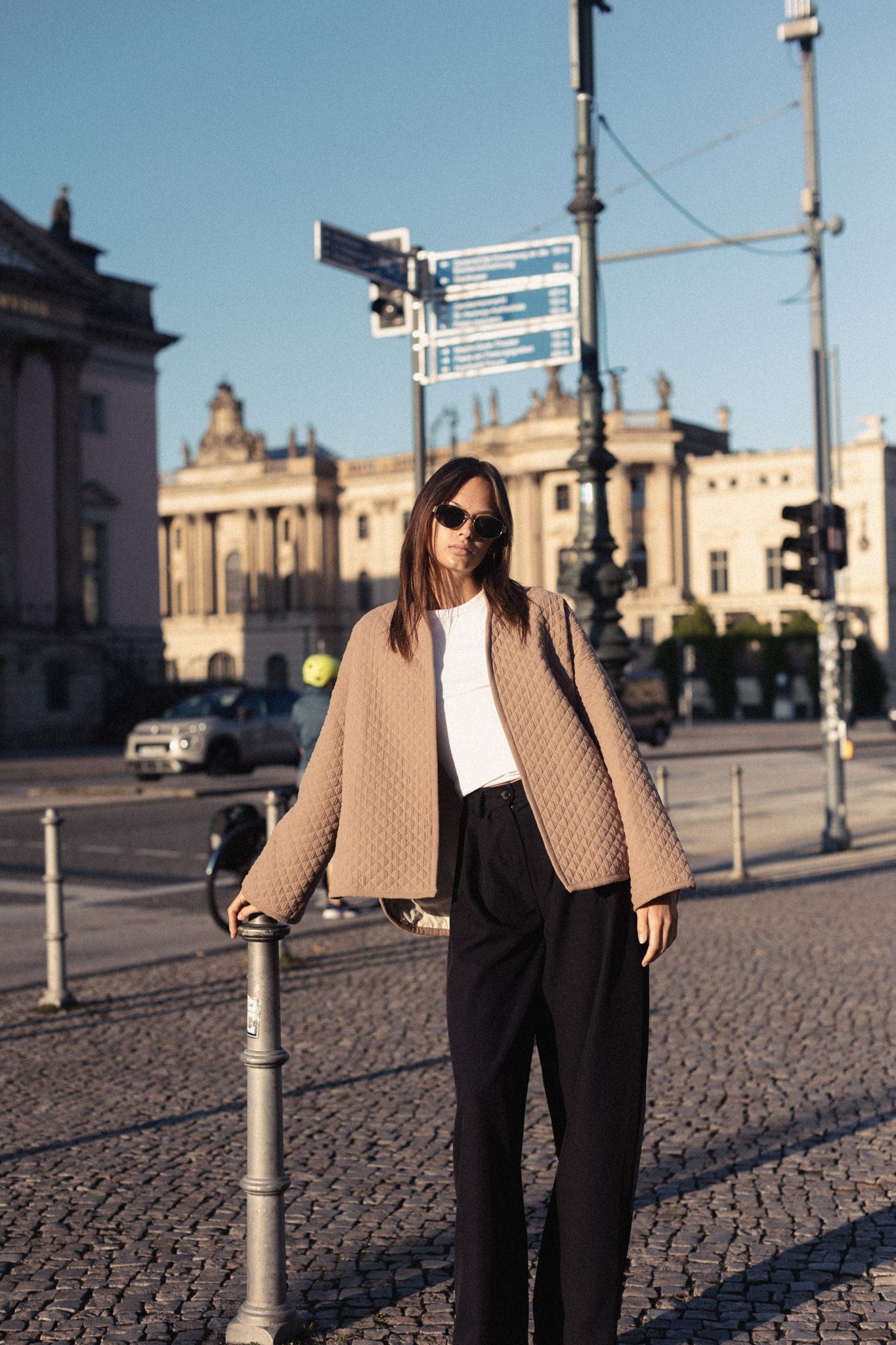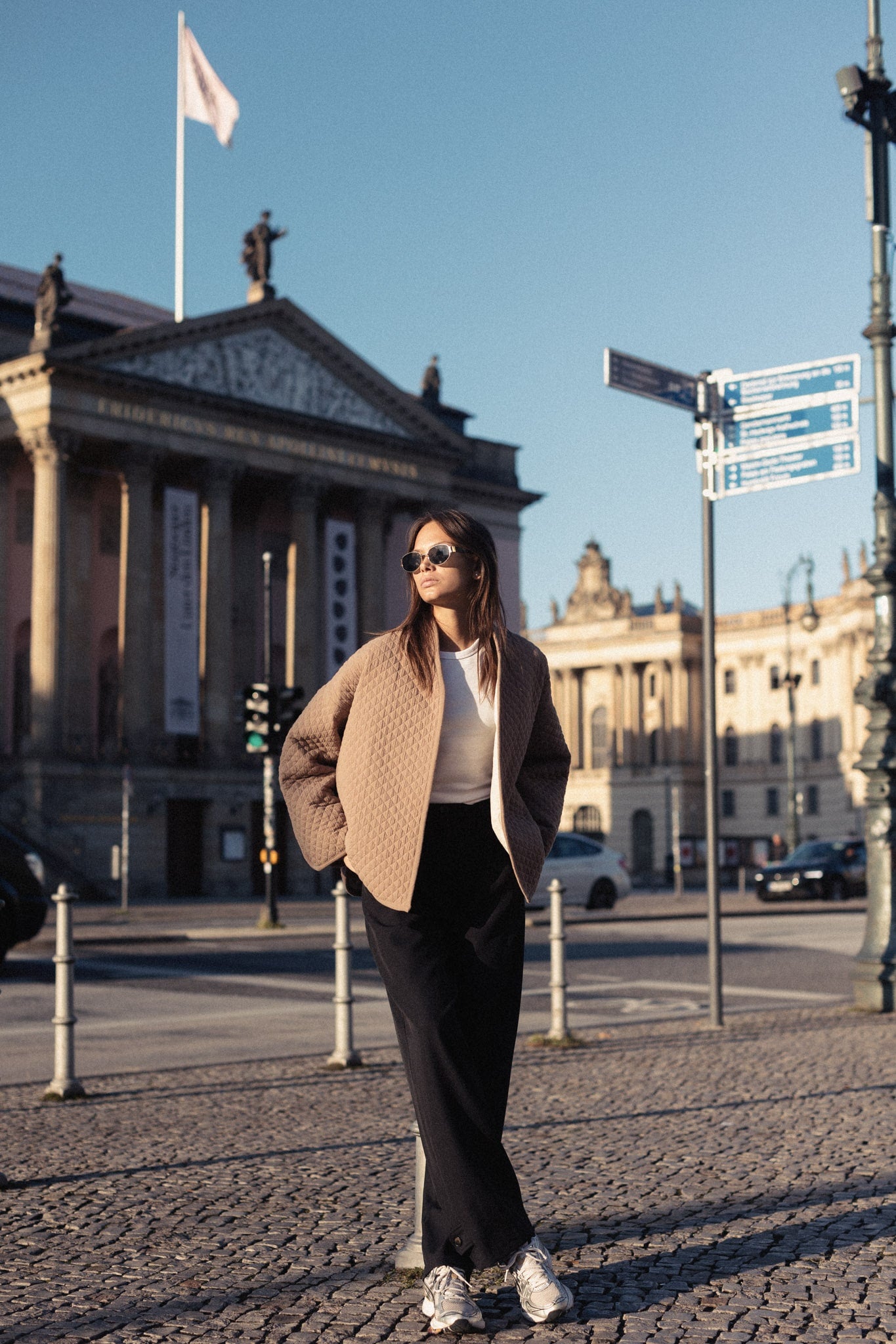 Prešívaná bavlnená bunda RIO bola Vašou minuloročnou láskou. Tento rok som vybrala neutrálnejšie farby a jednou z nich je táto beige. Má oversized strih a jej strih definuje výrazný zadný diel s oválnym bočným výstrihom, ktorý sa nesie skrz celej kolekcie. Nájdete ho totiž vo viacerých modeloch, aby sa dali spolu dokonale kombinovať. Je podšitá béžovou bavlnenou látkou, má zaujímavo ukončené rukávy s decentým prekrytým výstrihom. Pre zachovanie jej čistej línie bez rušivých elementov na nej nenájdete zapínanie, ale jej pevný materiál Vám zabezpečí, že sa bunda LENA nebude otvárať. A každopádne, viete si pod ňu obliecť jeden z našich vlnených nátelníkov. Dokonale sedí k športovému looku. V Berlíne som k nej Lilii obliekla čierne nohavice z oblekového setu NOX a bol to dokonalý match. Alebo skôr preferujete total beige look? Potom siahnite po nohaviciach ARDEN.