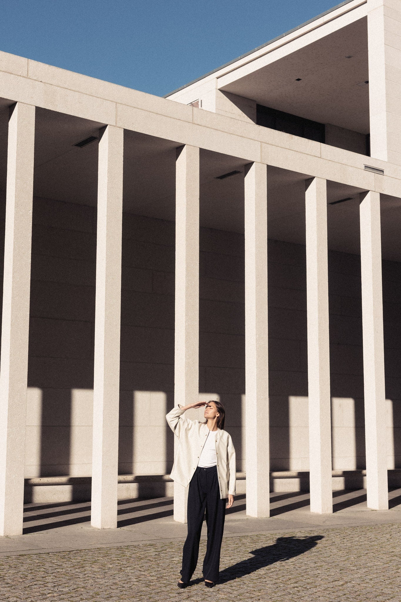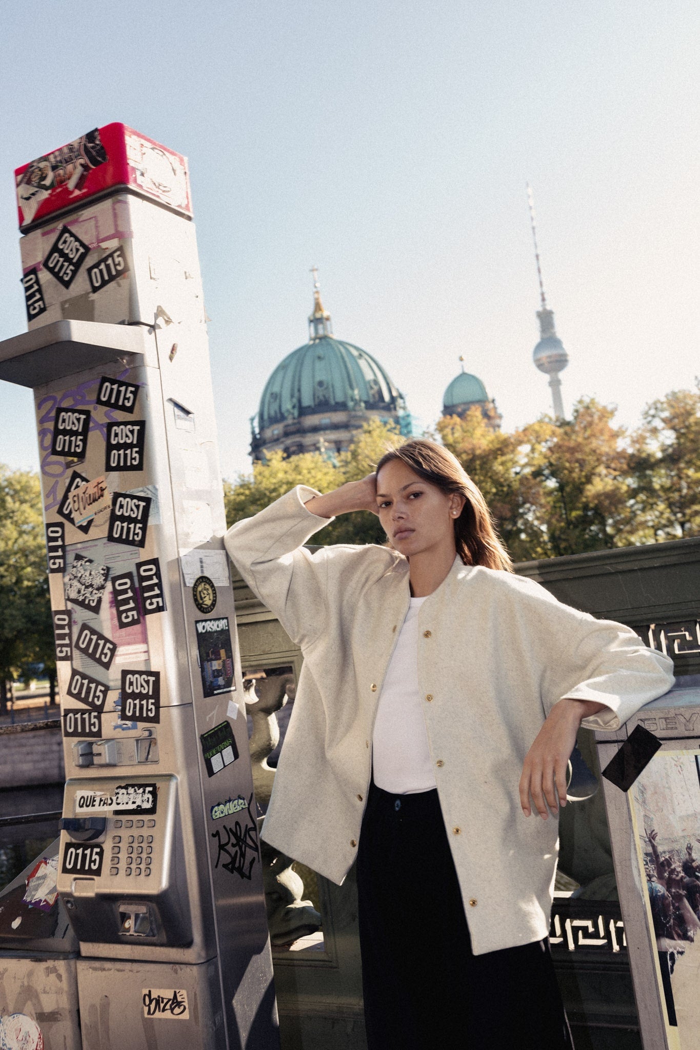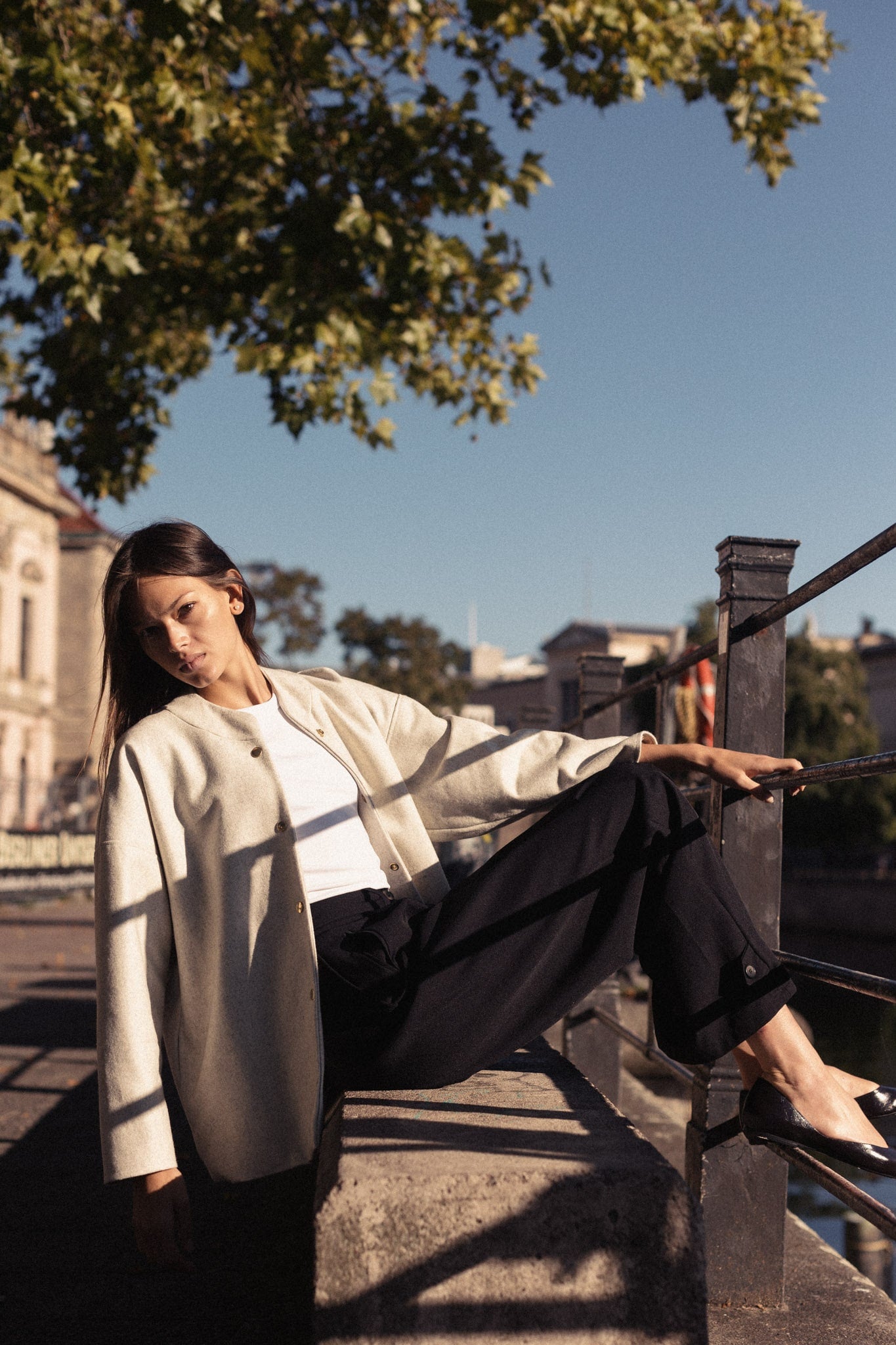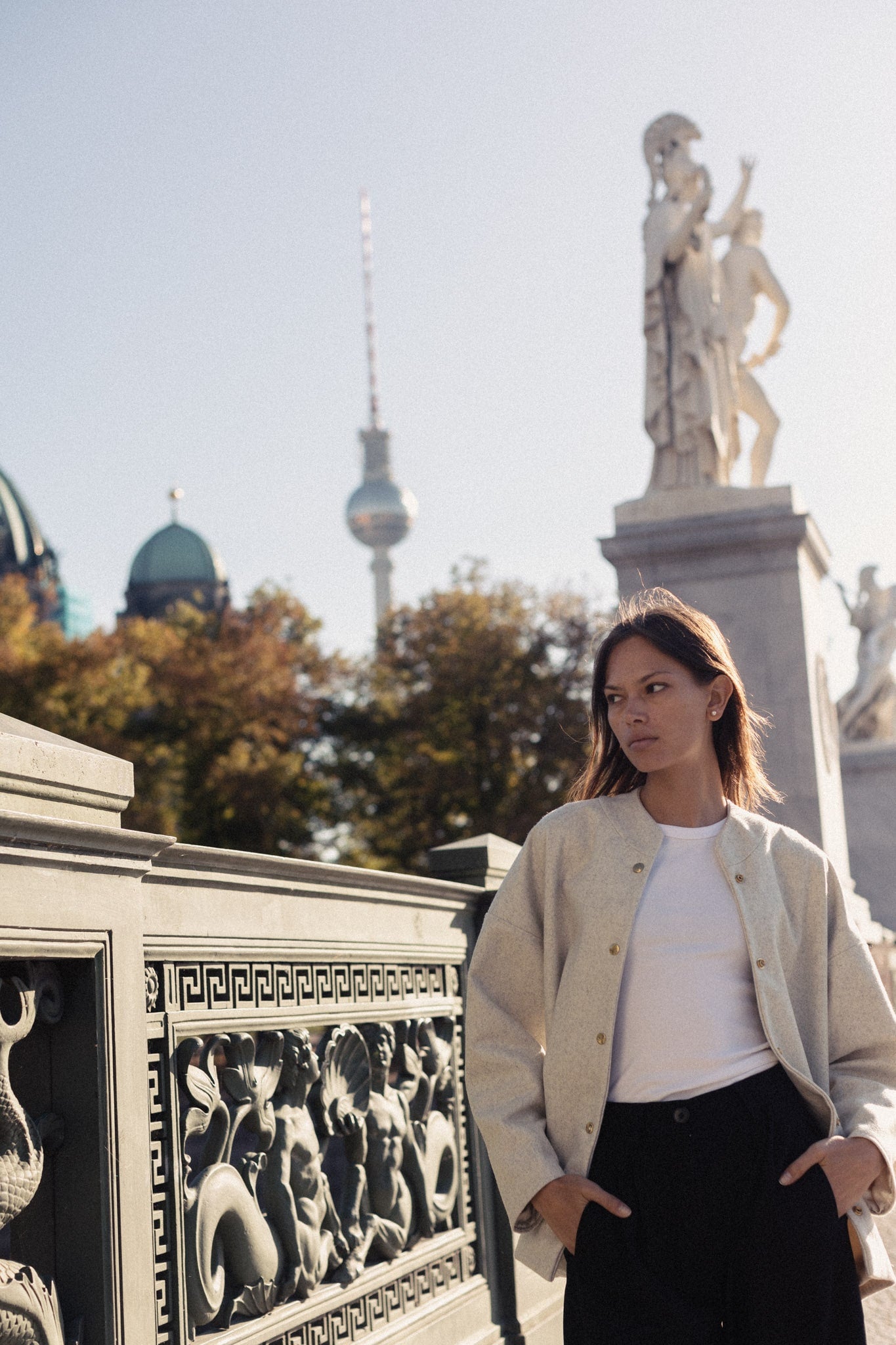 Vlnená bunda LOTTE je nadčasový kúsok, ktorý tvorí trojicu vlnených vrchných vrstiev z novej kolekcie Berlin poise. Má jemné melanžové vlákno ,raglanový rukáv a je podšitý svetlou viskózovou látkou. Zdobia ho zlaté cvokové gombíky, výrazne prešitie po švoch a vrecká po bokoch. Čo sa týka strihu, je ušitý do jemného zaoblenia a má stojačik namiesto klasického goliera. Skvele sa hodí ku casual outfitu, ale doladíte ho aj ku čiernym nohaviciam NOX.